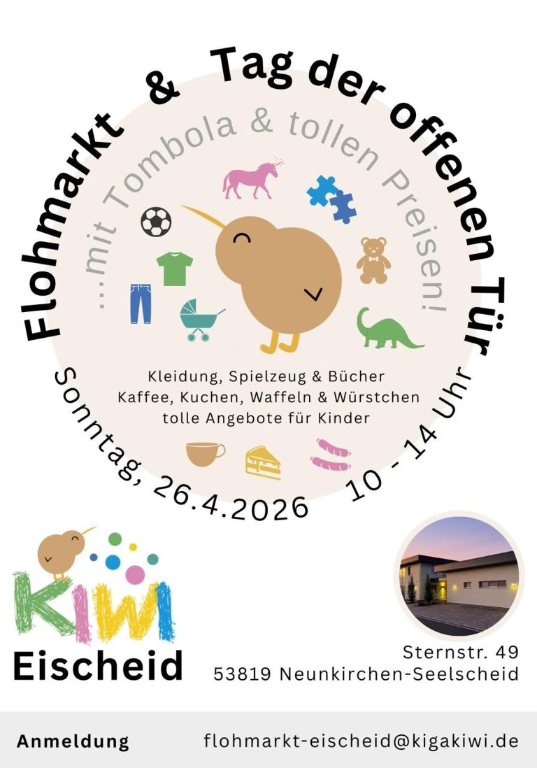 Wir laden Sie herzlich zu unserem Tag der offenen Tür mit Flohmarkt ein. Freuen Sie sich auf einen abwechslungsreichen Tag im KiWi Eischeid. Neben der Möglichkeit, auf dem Flohmarkt Kleidung, Spielsachen und Bücher zu erwerben, haben Sie auch die Gelegenheit, unsere Einrichtung näher kennenzulernen. In der Cafeteria laden wir Sie ein, bei Kaffee und Kuchen miteinander ins Gespräch zu kommen. Zudem erwarten Sie in den Gruppen verschiedene Spiel- und Bastelangebote. Bei unserer Tombola haben Sie die Chance, attraktive Preise zu gewinnen. Das KiWi-Team Eischeid freut sich auf einen schönen Sonntag mit Ihnen.